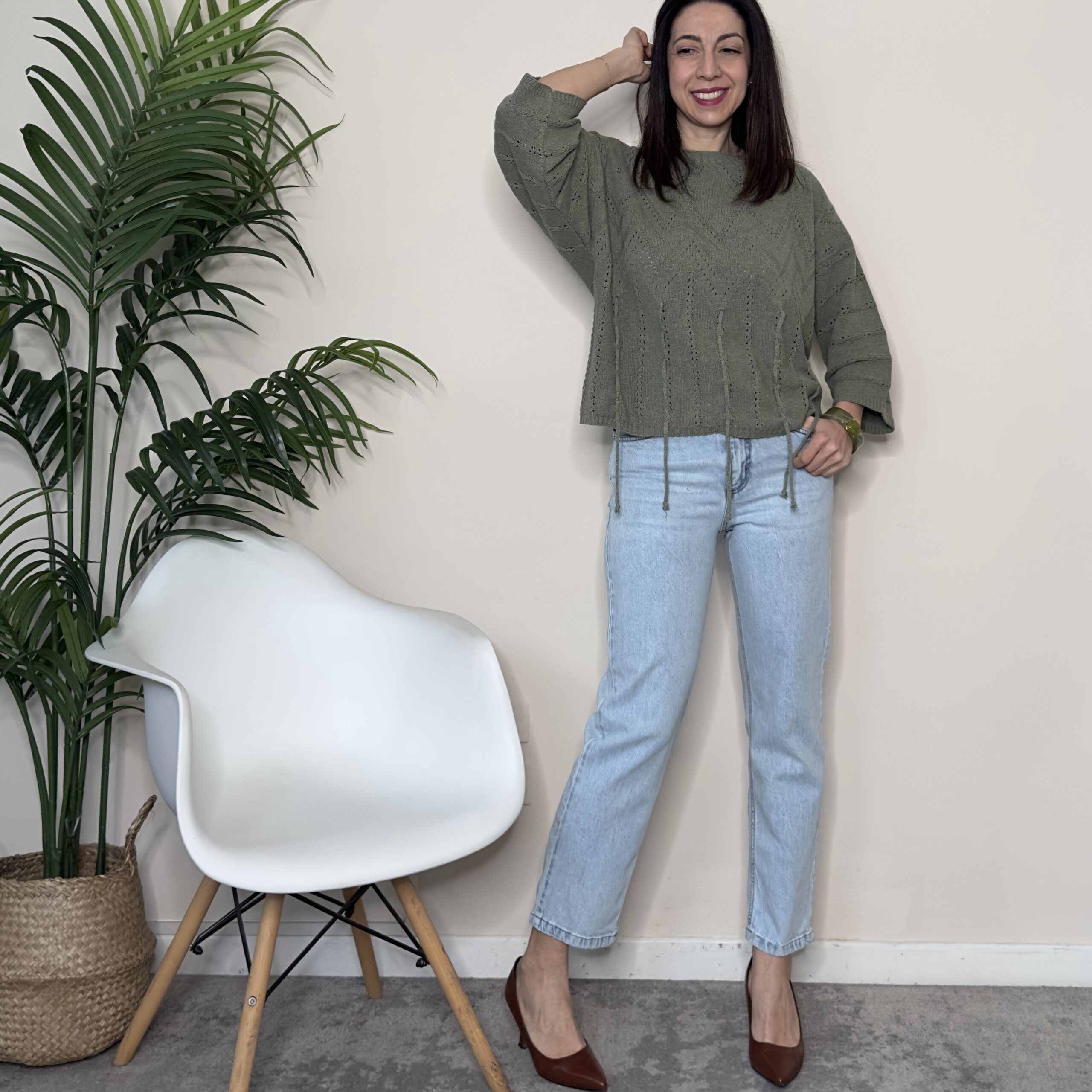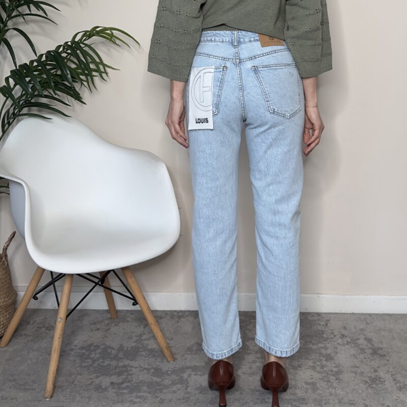 Descrizione: Jeans trombetta blu sfrangiato sul fondo, completo di charms