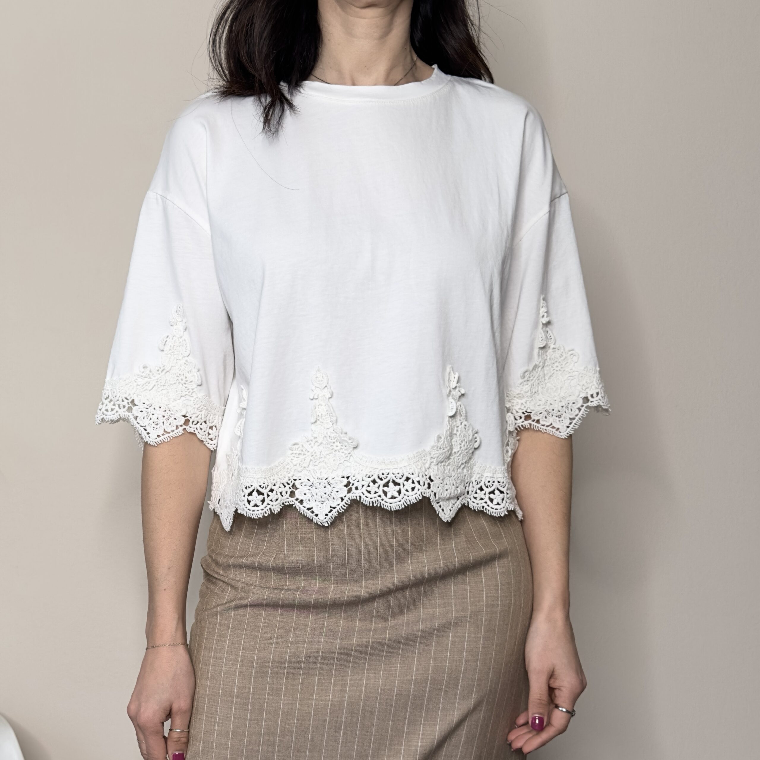 Descrizione: T-shirt croppata con pizzo