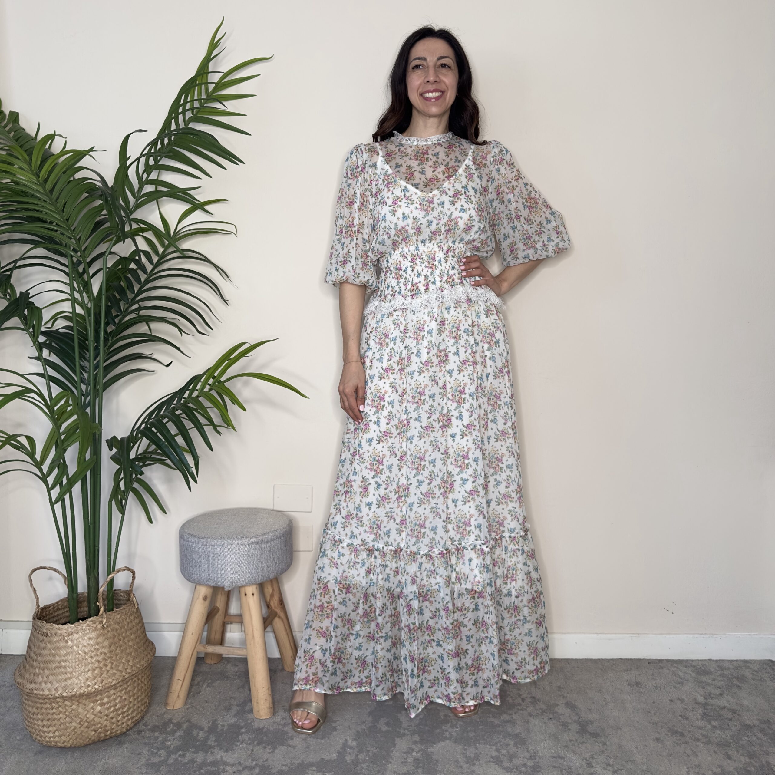 Descrizione: Abito lungo con elastico in vita. Completo di sottoveste
