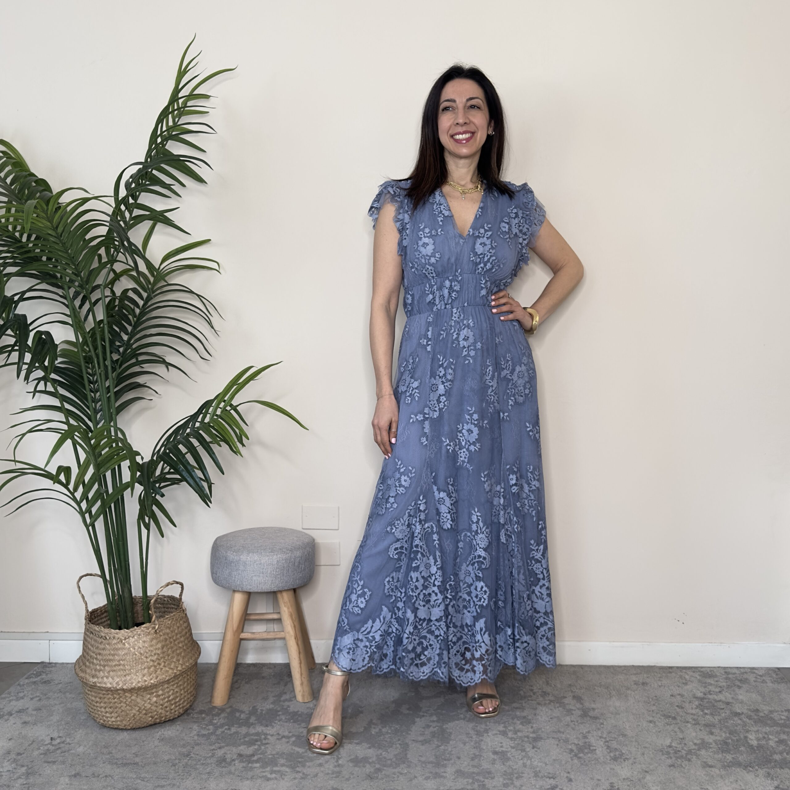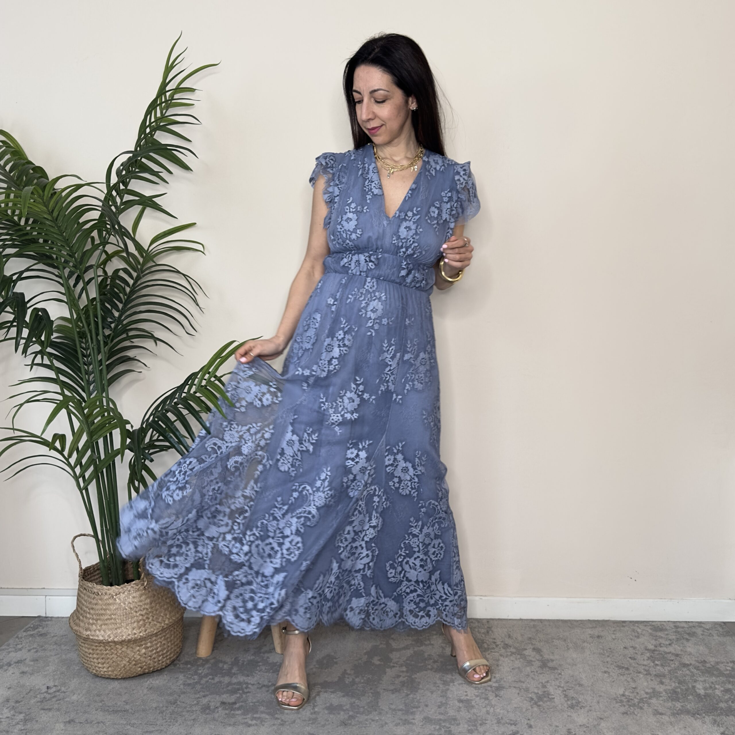 Descrizione: Abito lungo in pizzo con elastico in vita
