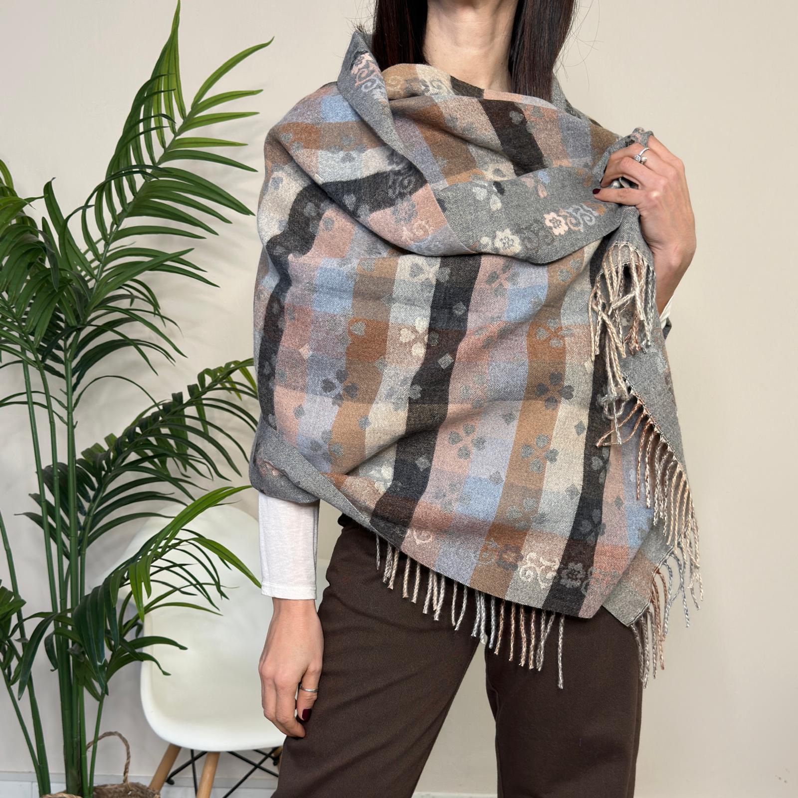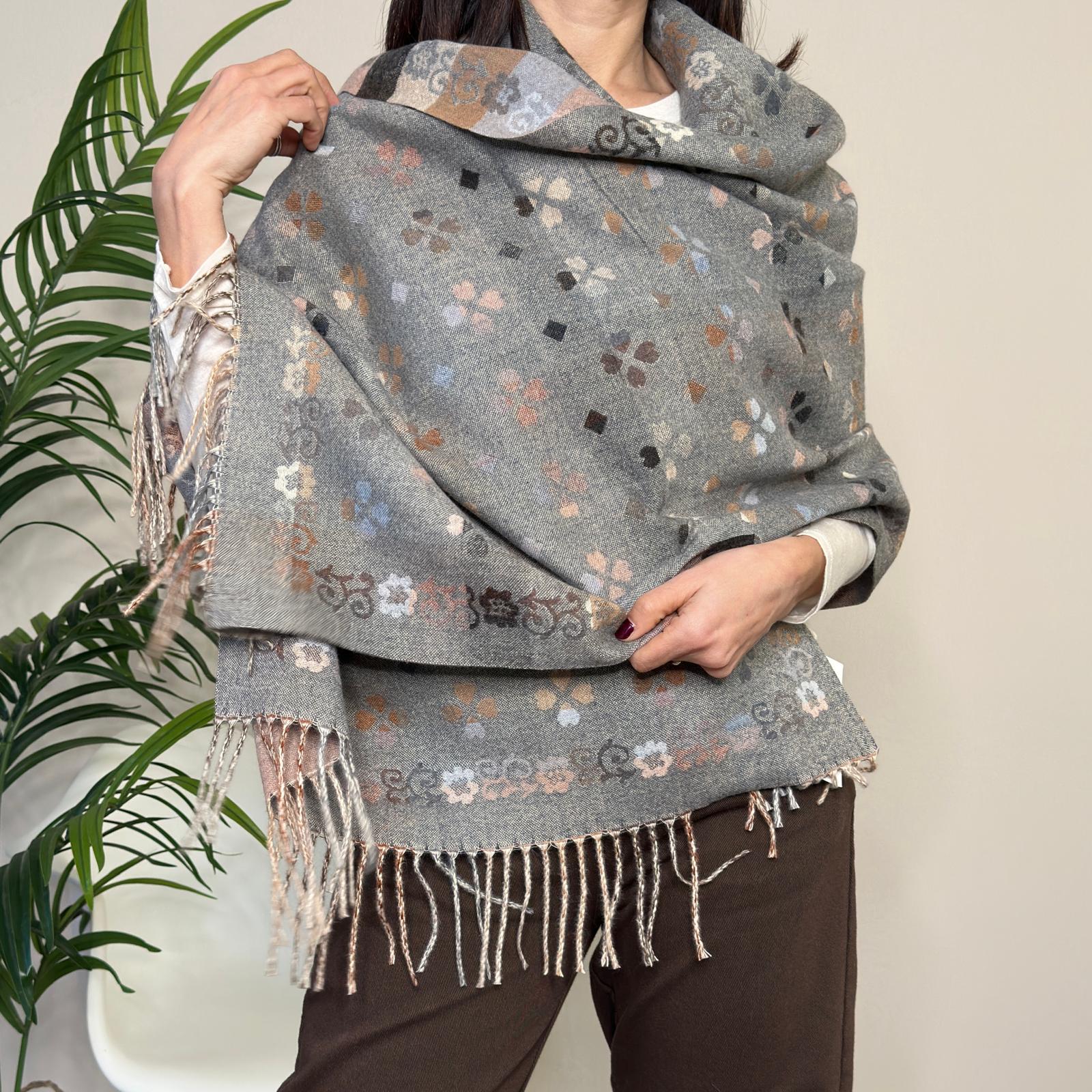 Descrizione: Sciarpona double grigio – doppia fantasia