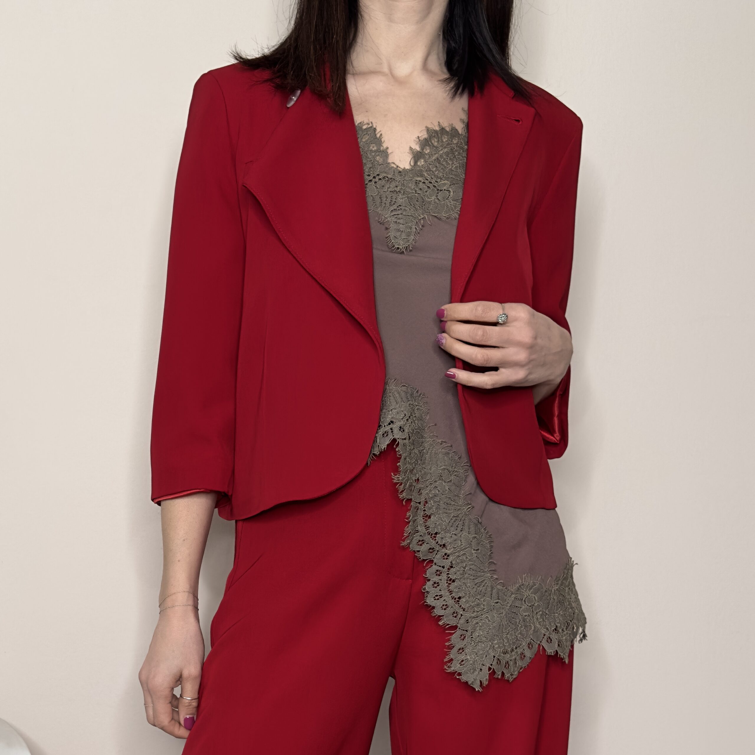 Descrizione: Giacca lavorazione macramè, con cintura a cravatta e spilla. (La fantasia della cintura può variare)