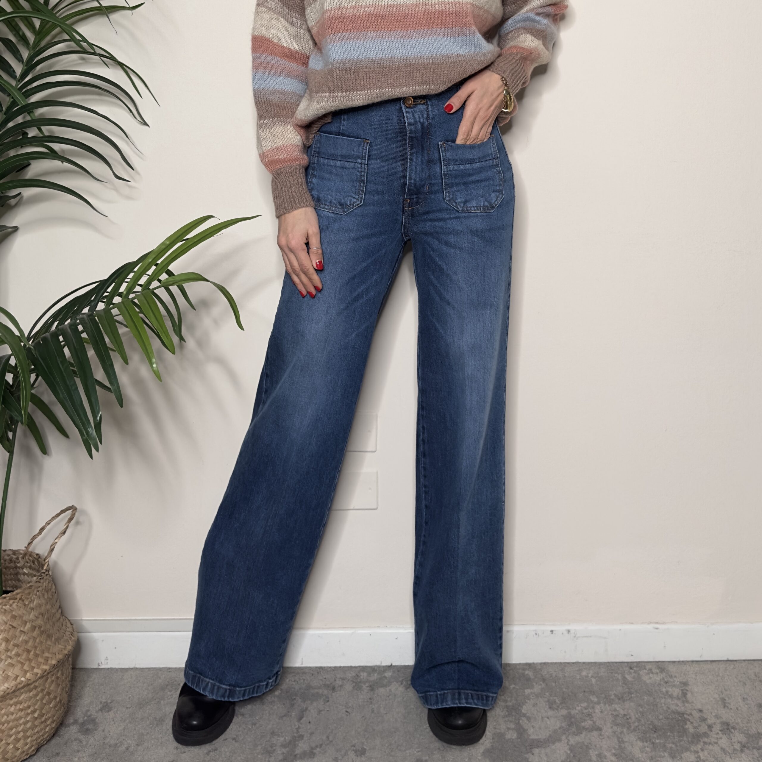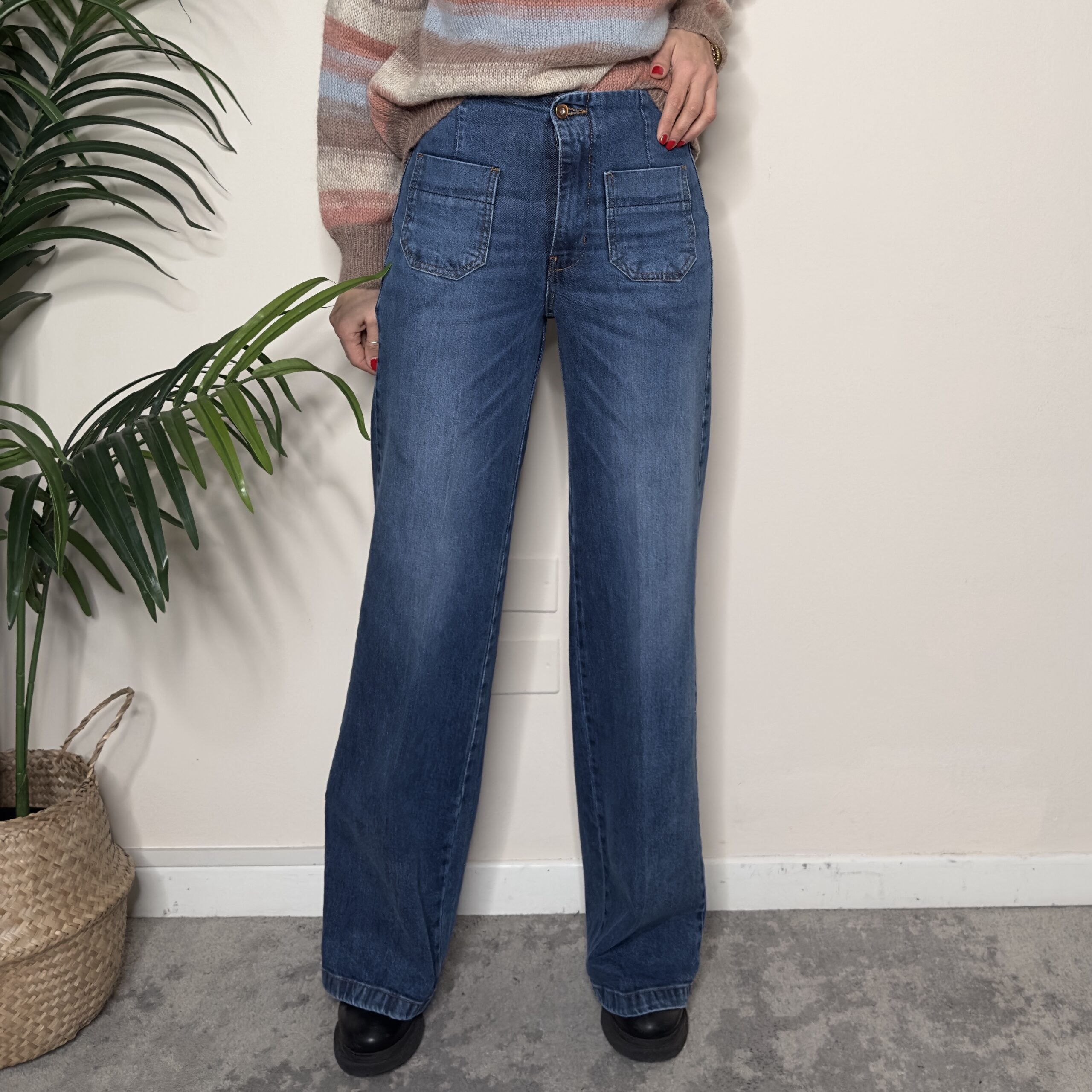 Descrizione: Jeans trombetta blu sfrangiato sul fondo, completo di charms