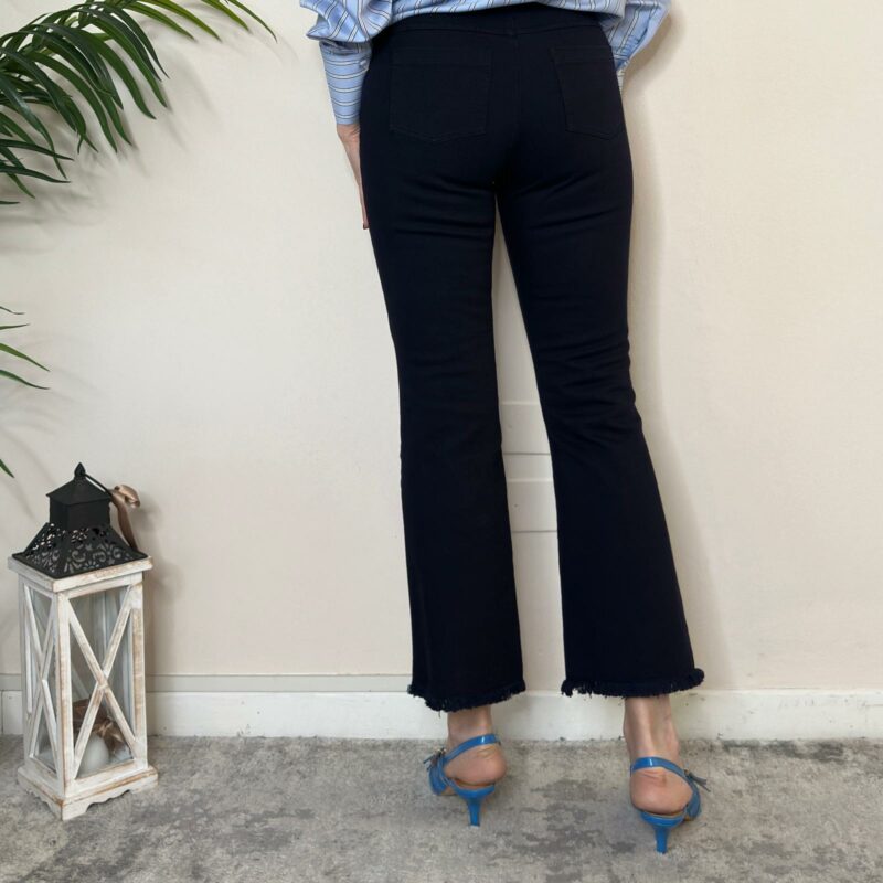 Descrizione: Jeans trombetta blu sfrangiato sul fondo, completo di charms